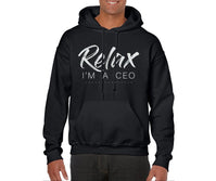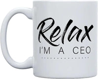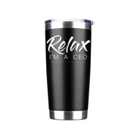 Introducing the 30oz Tumbler "Relax I'm A CEO" - a stylish and durable stainless steel tumbler with double-wall insulation. It keeps drinks hot or cold for hours. The sleek design features the phrase "Relax I'm A CEO" and is perfect for busy executives.